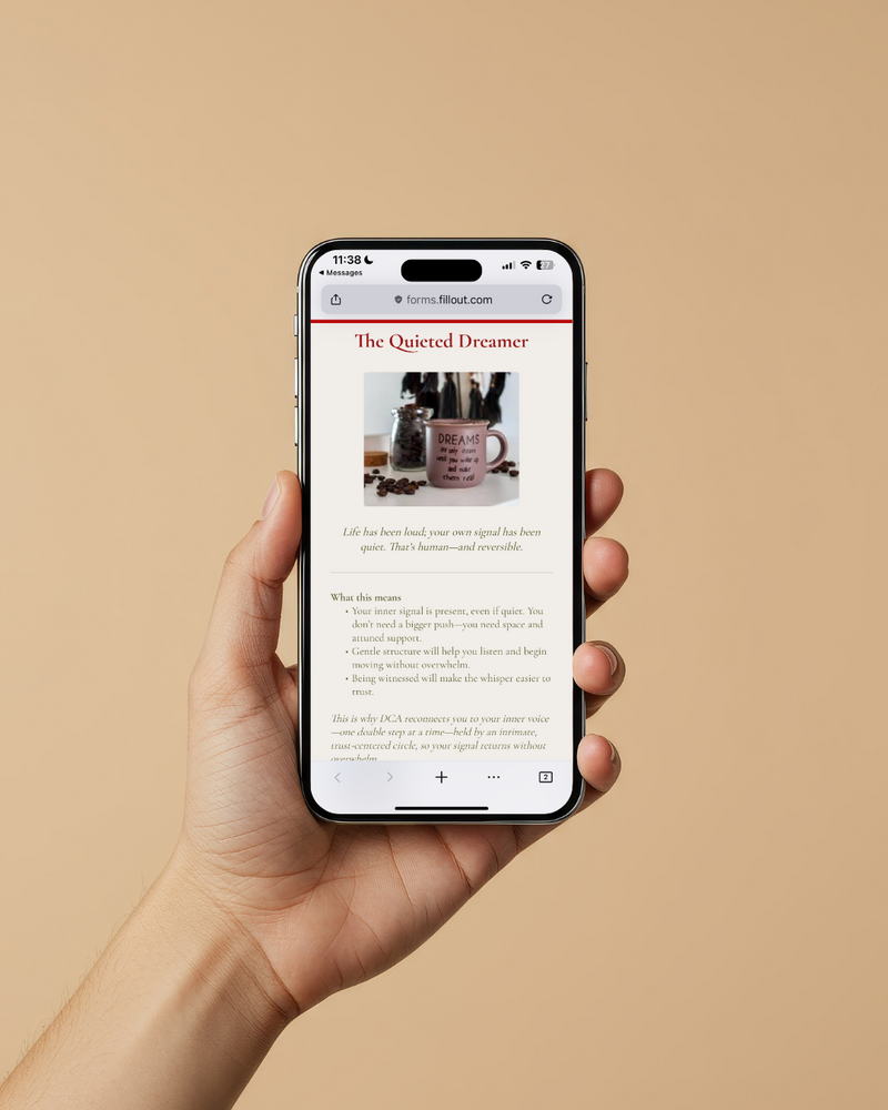 The Dream State Check-In Quiz helps you tune back into the signal of your own becoming. In just a few minutes, you’ll discover where your dream lives right now—quieted, stirring, rising, or fully embodied—and what simple next step will help you move closer to living it.